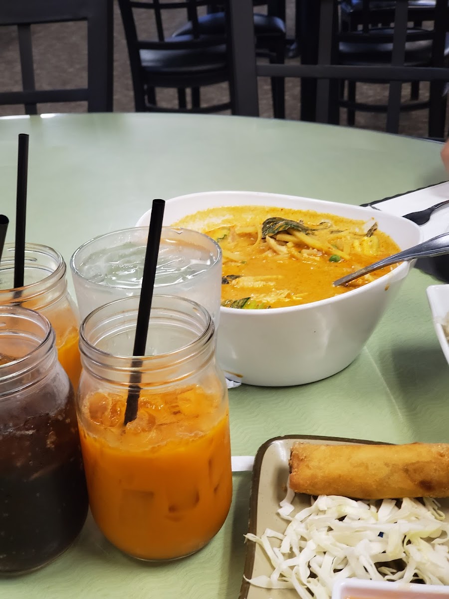 Went today for a late lunch today and food and service were great. Our waiter Bee was very attentive and made sure our iced tea was always refilled and even gave us to go cups. Portion sizes were very generous. We had the veggie spring rolls, green curry with soft tofu and drunken chow mein (spicy) with chicken. Don't order spicy unless you can really handle heat! It was the first time I ever saw my husband say a food was too hot for him.